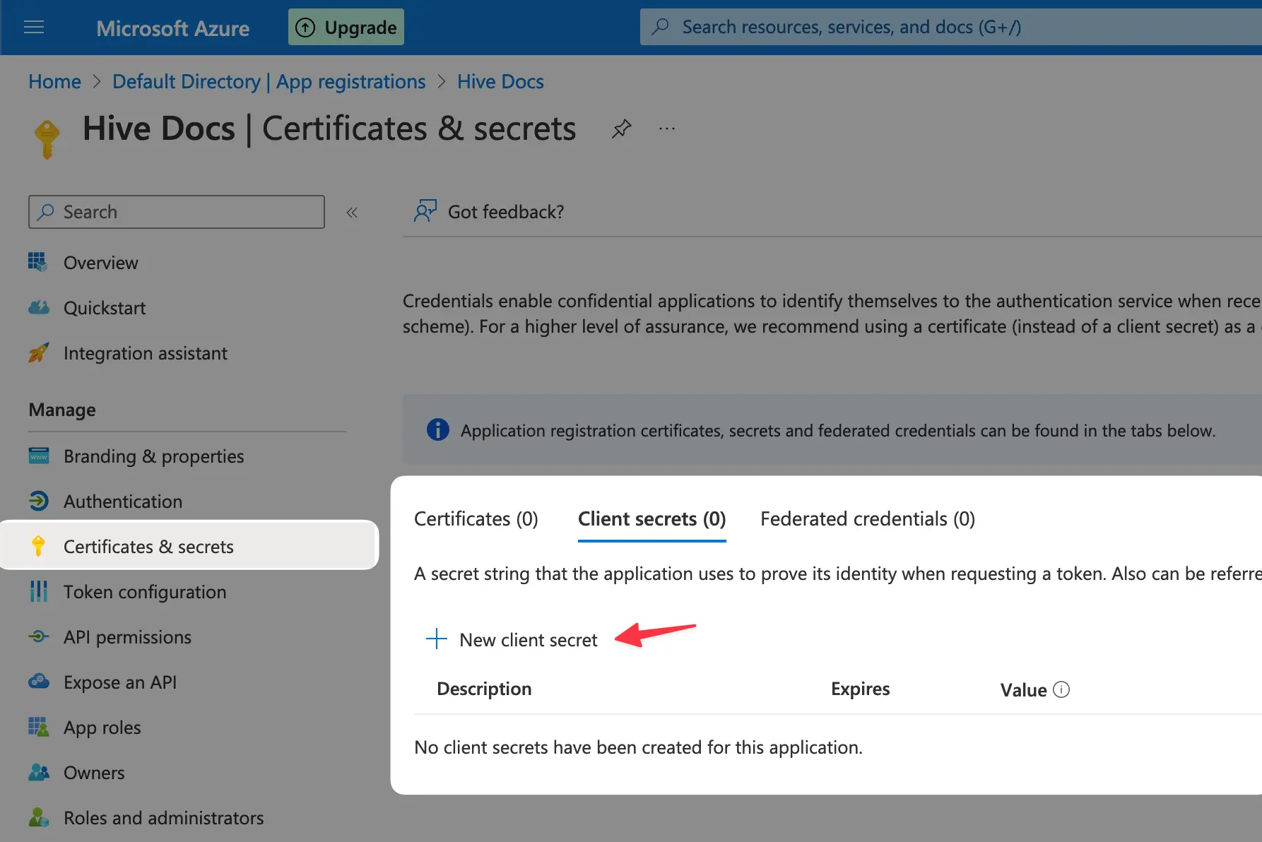 Now, create a new client secret for your app by navigating as the screenshot illustrates then on the